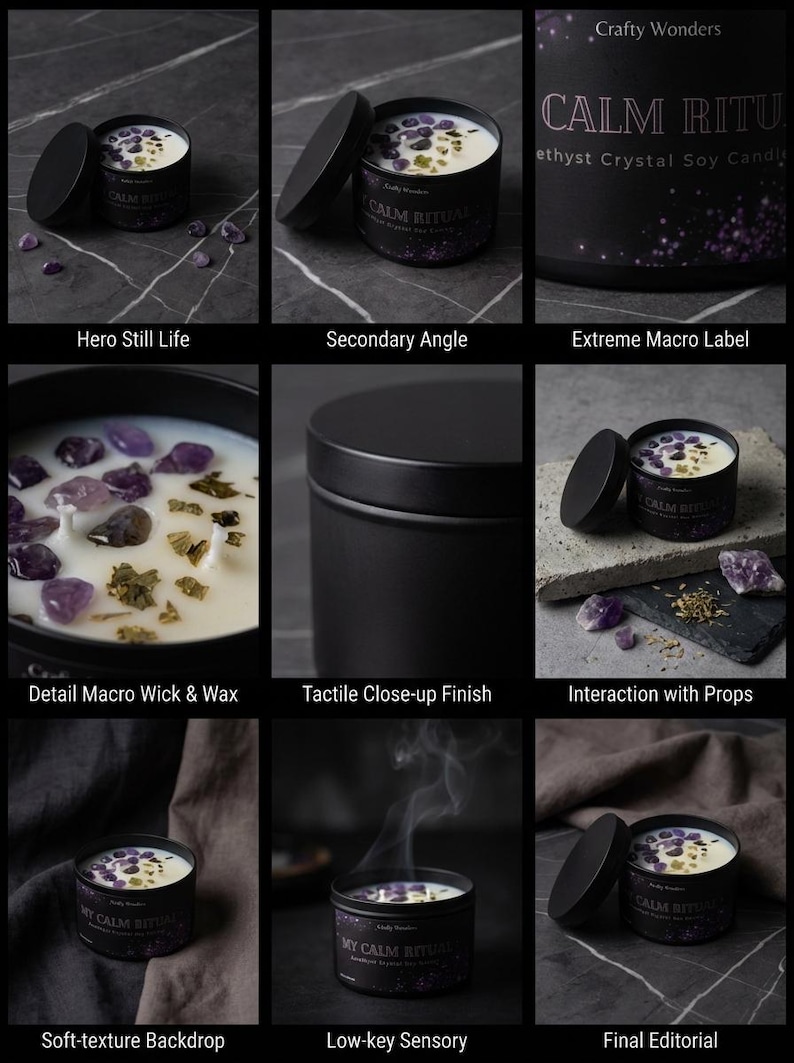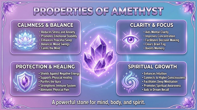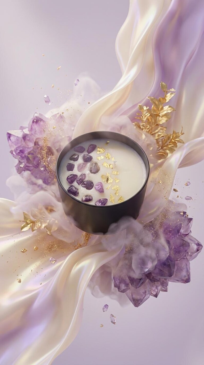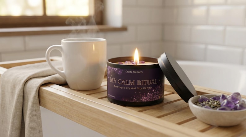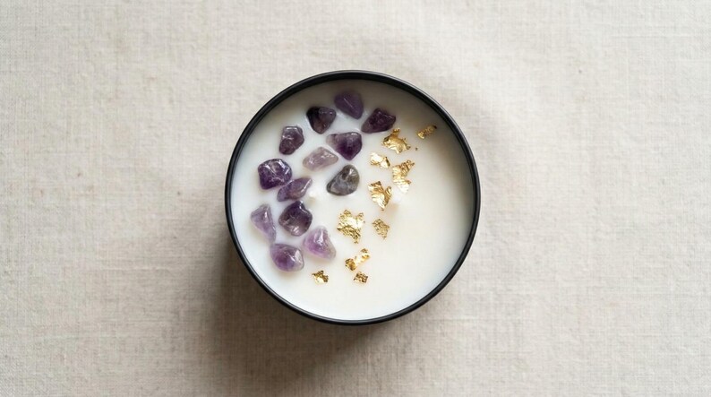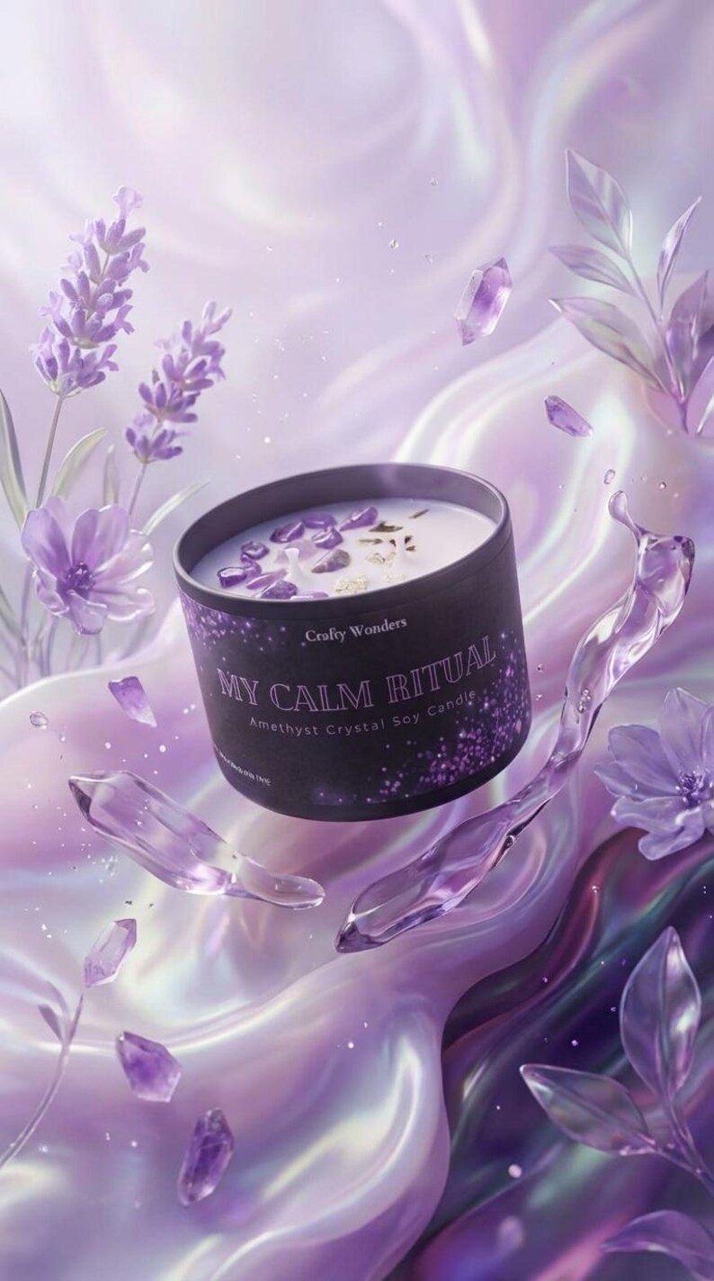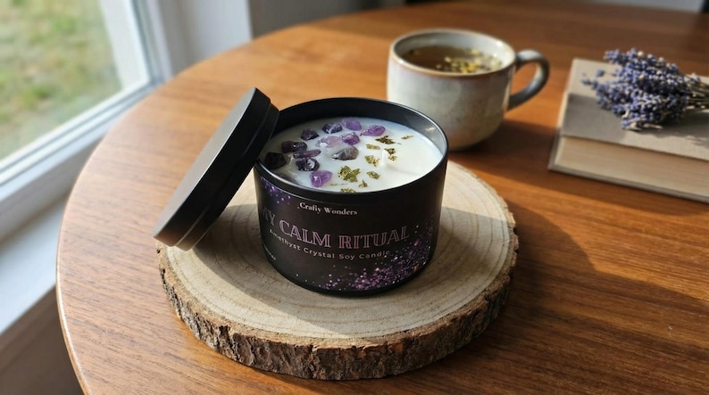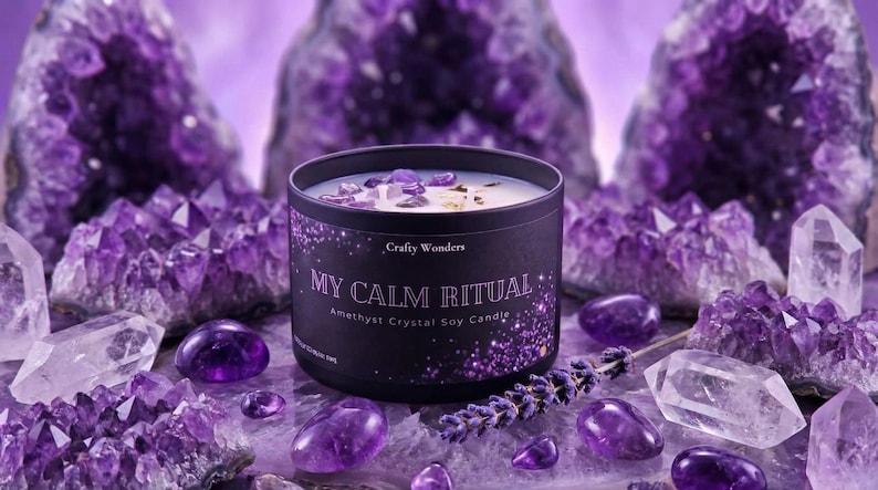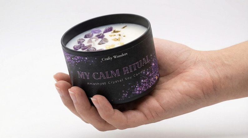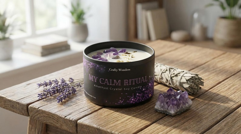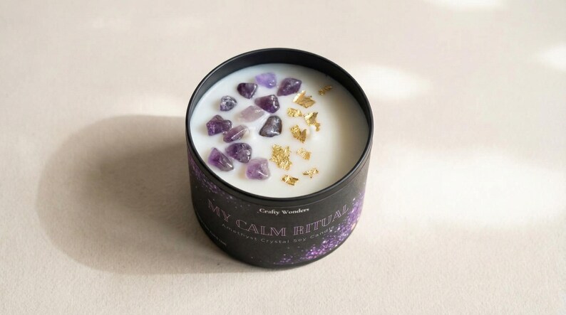 A calming handmade soy candle with real amethyst crystals. Perfect for relaxing evenings and cozy spaces.