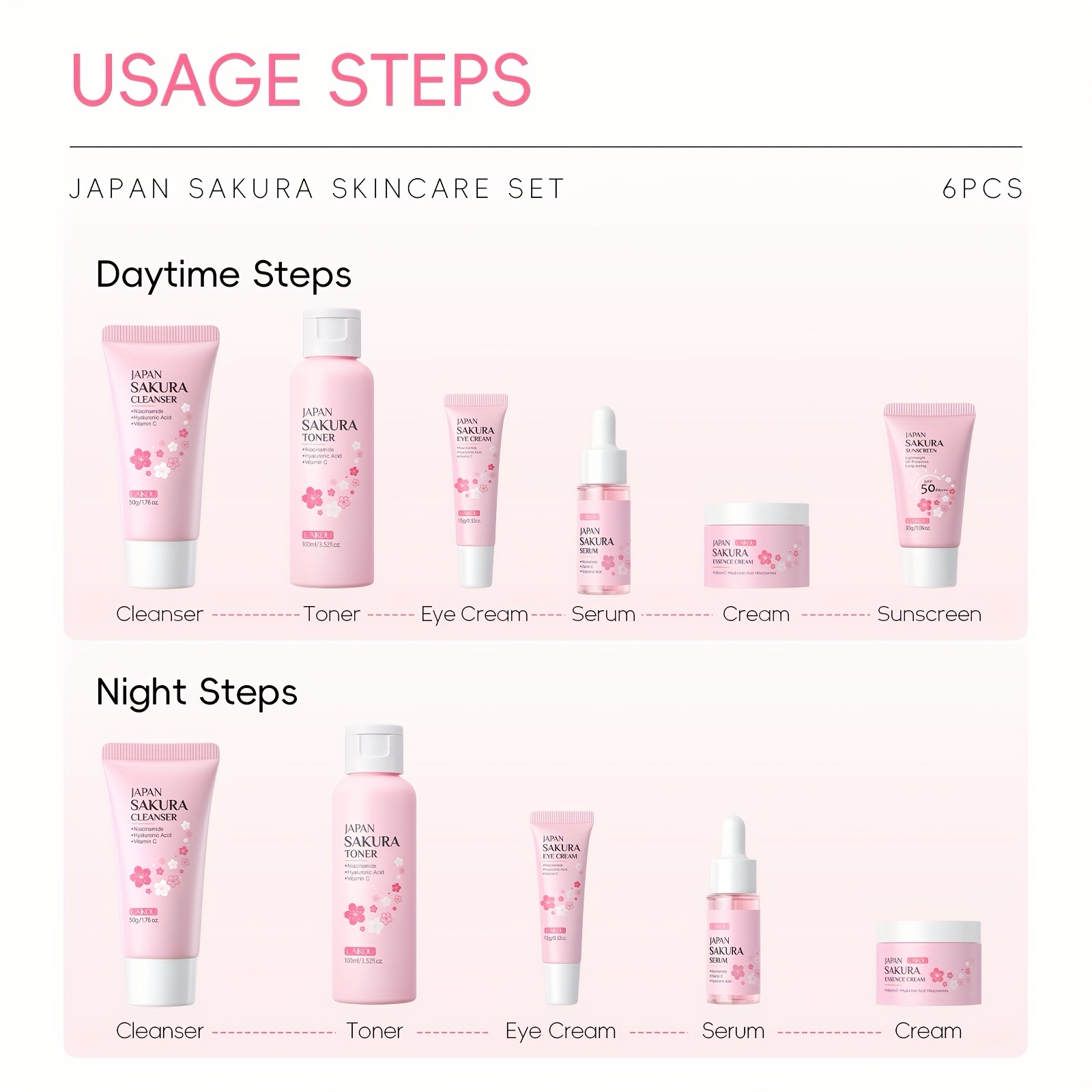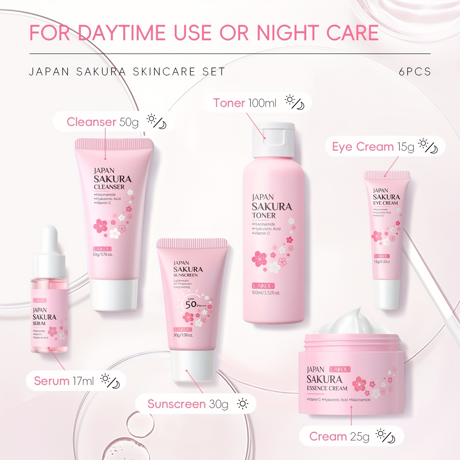The LAIKOU Sakura Glow Set is a complete skincare ritual inspired by soft, radiant skin. Every step works together to cleanse, hydrate, brighten, and protect — so your face looks fresh, smooth, and healthy without stress or guesswork.