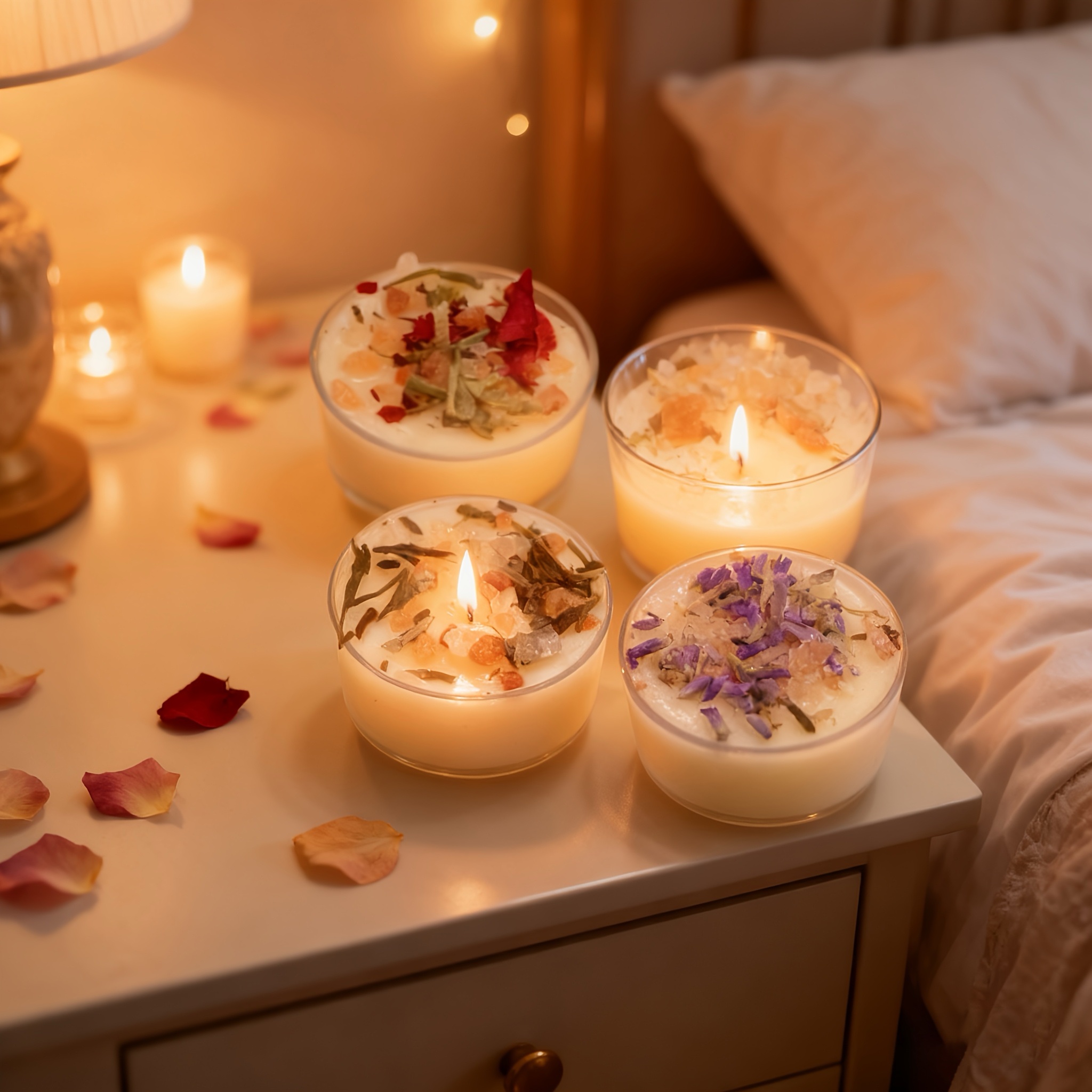 This set includes 4 premium soy wax tea candles, each offering a clean burn of up to 7 hours. Infused with four sophisticated scents — Rose, Lavender, Cedar, and Sage — these candles are perfect for relaxation, romantic evenings, and elevated home décor.