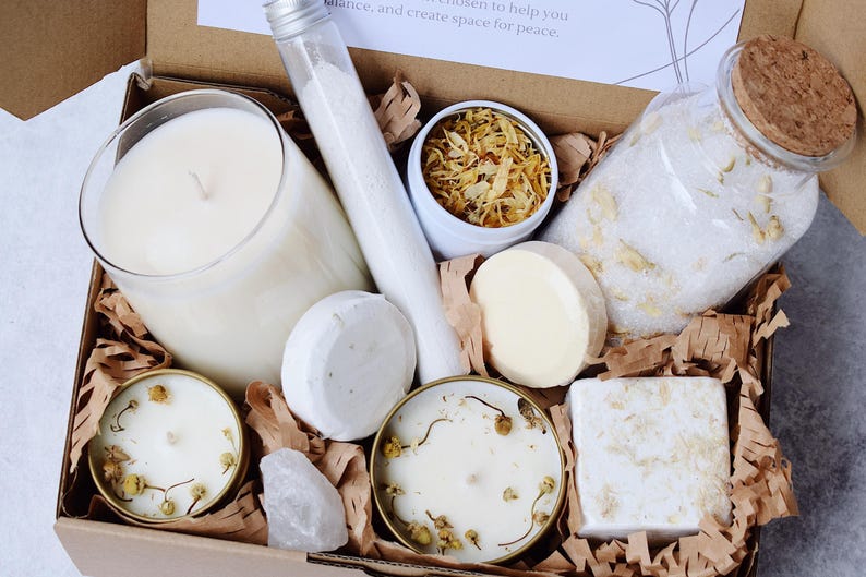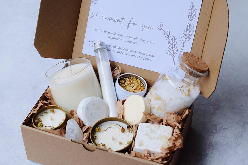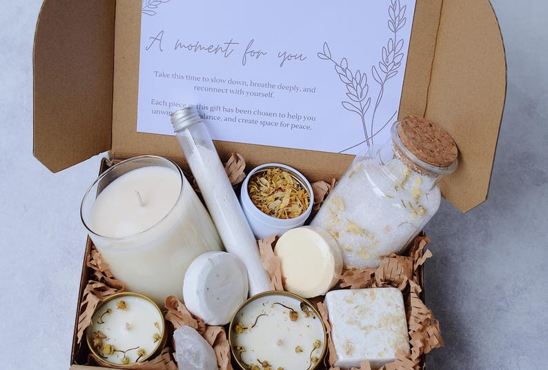 A calming self-care gift for anyone who needs to relax and slow down. This spa gift box brings peaceful, spa-like comfort at home.