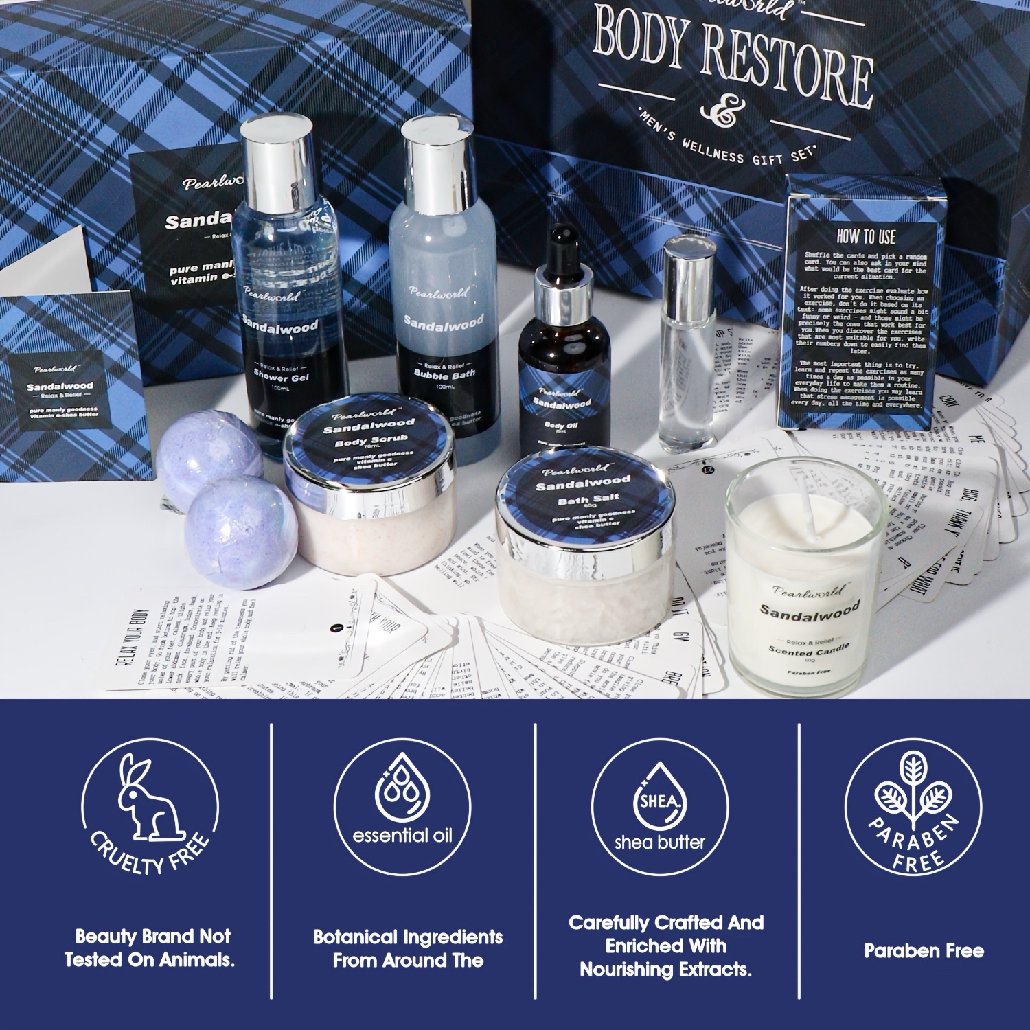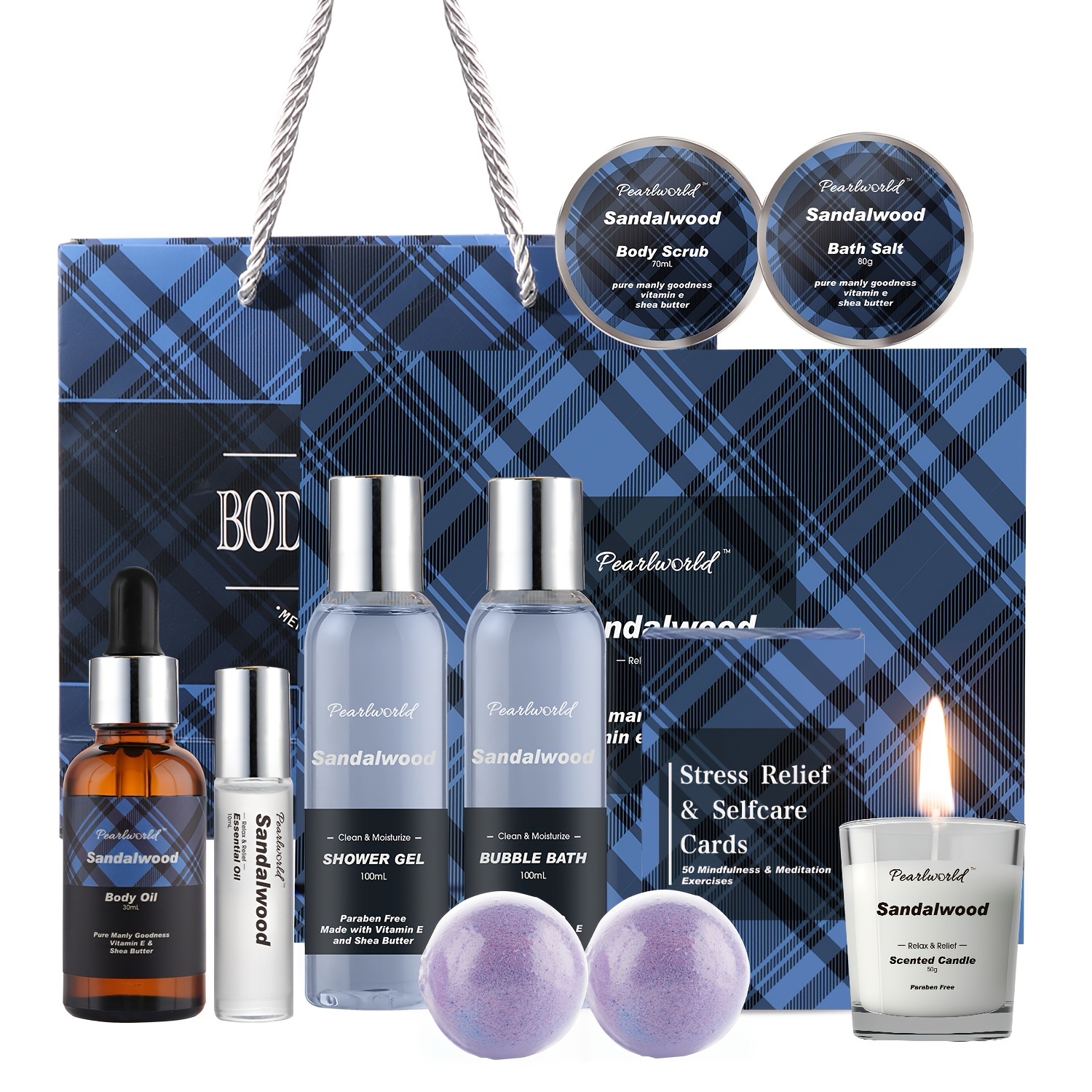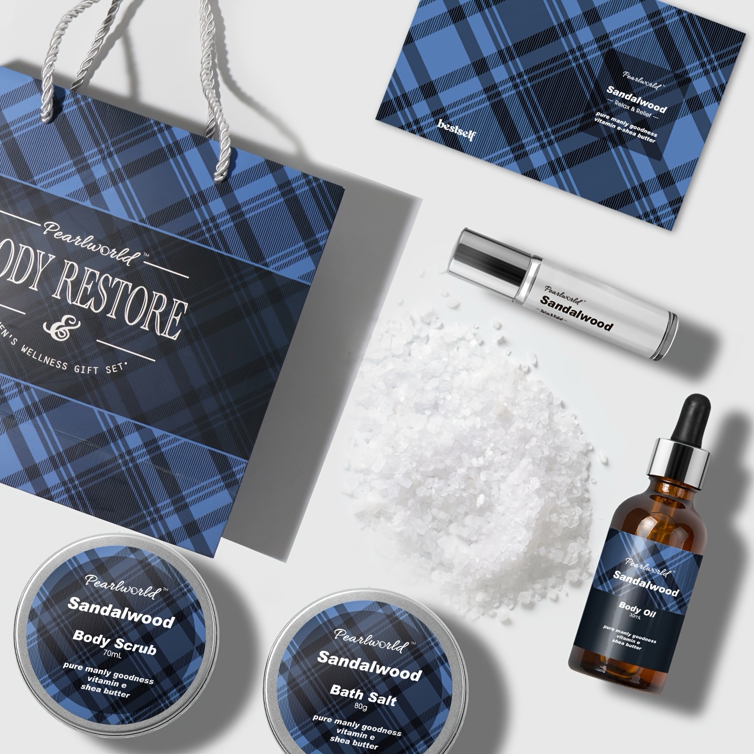 Includes body scrub, bath salts & sandalwood-scented care products